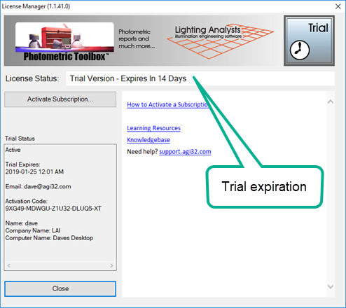 Your Trial license is now activated! Your expiration will show on the License Status line (below). You can close the License Manager and proceed with the software.