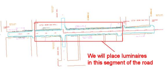 Because the road varies in width, we will use the Array command to place luminaires in the segment shown here, where the width is relative consistent.