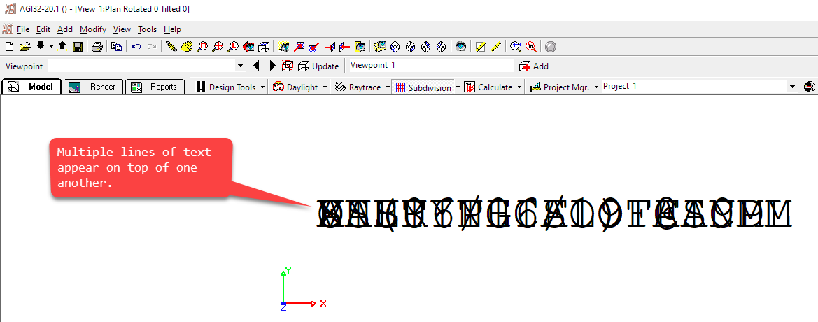 When AGi32 imports MText (Multiline Text), it uses the font data to estimate the width of the text block to apply text wrapping. With a non-native Windows font (Autodesk shx), the font file can't be found. Meaning, the width can't be estimated and the program puts all the MText lines onto a single line (on top of one another).